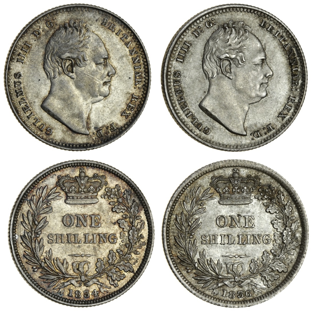 William IV (1830-37), Shillings (2), 1834, bare head right, rev. crowned value in wreath (ESC 2489); 1836, similar (ESC 2494; S.3835), the first with marks on cheek, otherwise extremely fine, the second uncirculated (2)