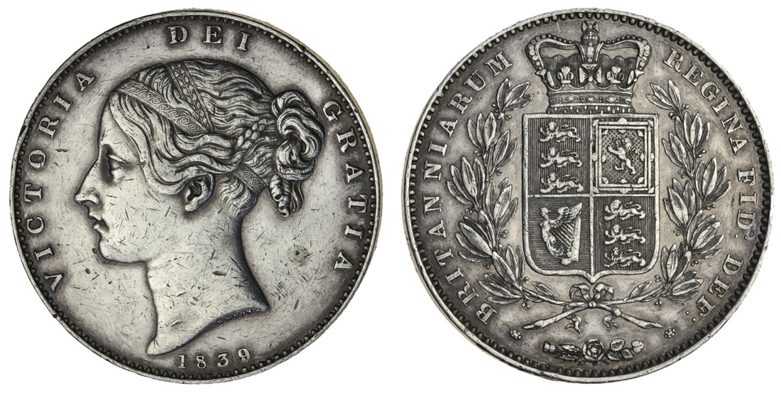 Victoria (1837-1901), proof Crown, 1839, en medaille, young head left, rev. crowned shield within wreath, edge plain (ESC 2651; S.3882), possibly once mounted, overt surface marks in fields, otherwise good very fine, rare