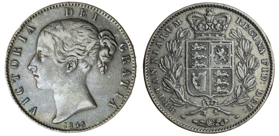 Victoria (1837-1901), Crown, 1845, cinquefoil stops on edge, young head left, rev. crowned shield (ESC 2564; S.3882), minor edge bruise and rubbed, otherwise good fine