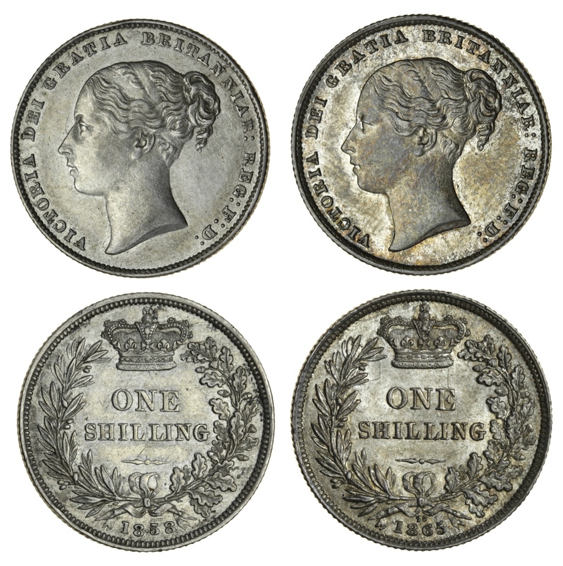 Victoria (1837-1901), Shillings (2), 1858, second young head left, rev. crowned value in wreath (ESC 3011); 1865, similar (ESC 3025; S.3904), the first about extremely fine, the second near uncirculated (2)