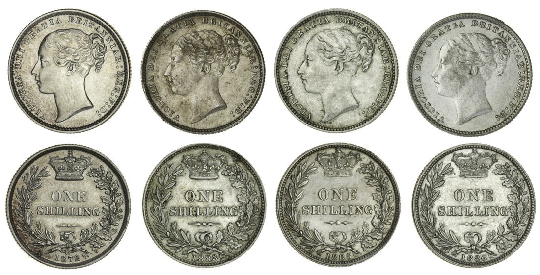 Victoria (1837-1901), Shillings (4), 1872, third young head left, rev. crowned value in wreath (ESC 3042; S.3906A); 1883, 1885, 1886, fourth head, similar (ESC 3072, 3076, 3078; S.3907), very fine to extremely fine (4)