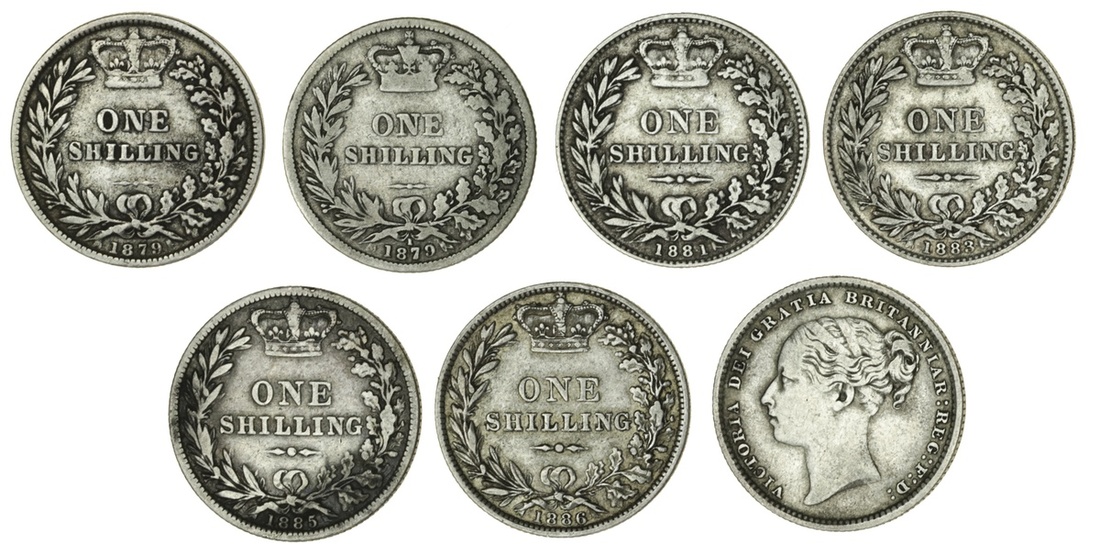 Victoria (1837-1901), Shillings (7), 1879, third young head left, rev. crowned value in wreath (ESC 3042; S.3906A); 1879, 1881, 1883, 1885, 1886, 1887, fourth young head, similar (ESC 3072, 3067, 3072, 3076, 3078, 3080; S.3907), fine to very fine (7)