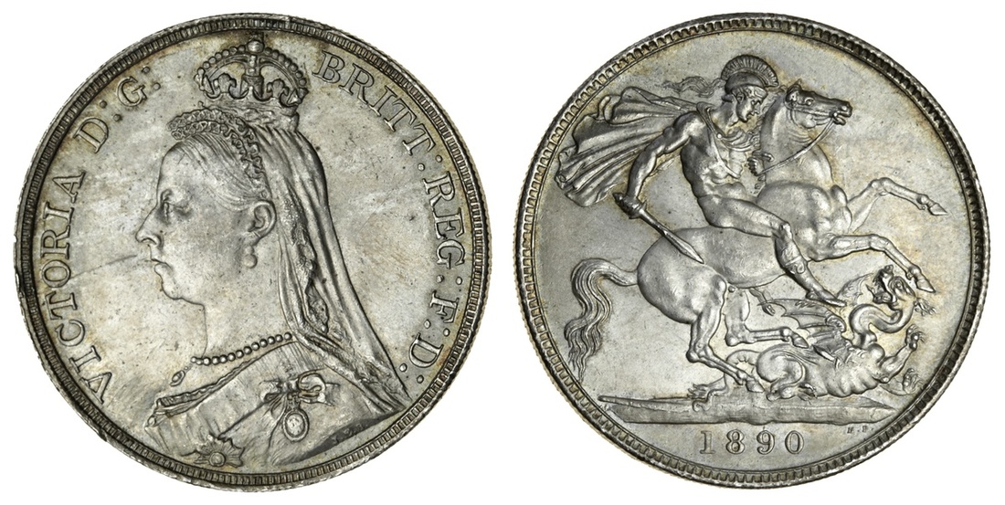Victoria (1837-1901), Crown, 1890, Jubilee bust left, rev. St. George and dragon (ESC 2590; S.3921), light edge knock at 9 o'clock on obverse, hairlines in fields, extremely fine with lustre