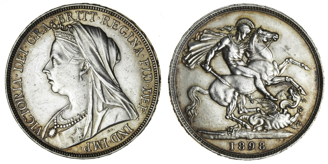 Victoria (1837-1901), Crown, 1898 lxii, veiled head left, rev. St. George and dragon (ESC 2605; S.3937), cleaned, some tone returning, about extremely fine