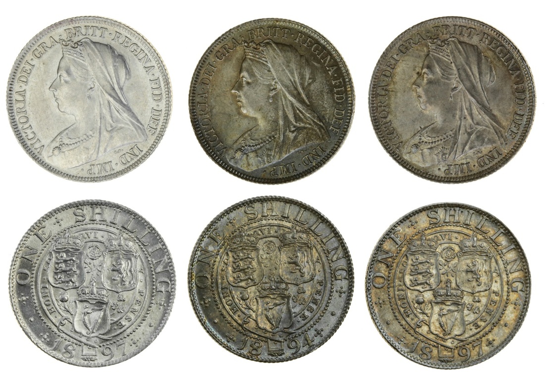 Victoria (1837-1901), Shillings (3), 1894, old veiled bust left, rev. three crowned shields in garter (ESC 3156; S.3940); 1897 (2), similar (ESC 3162; S.3940A), about uncirculated (3)