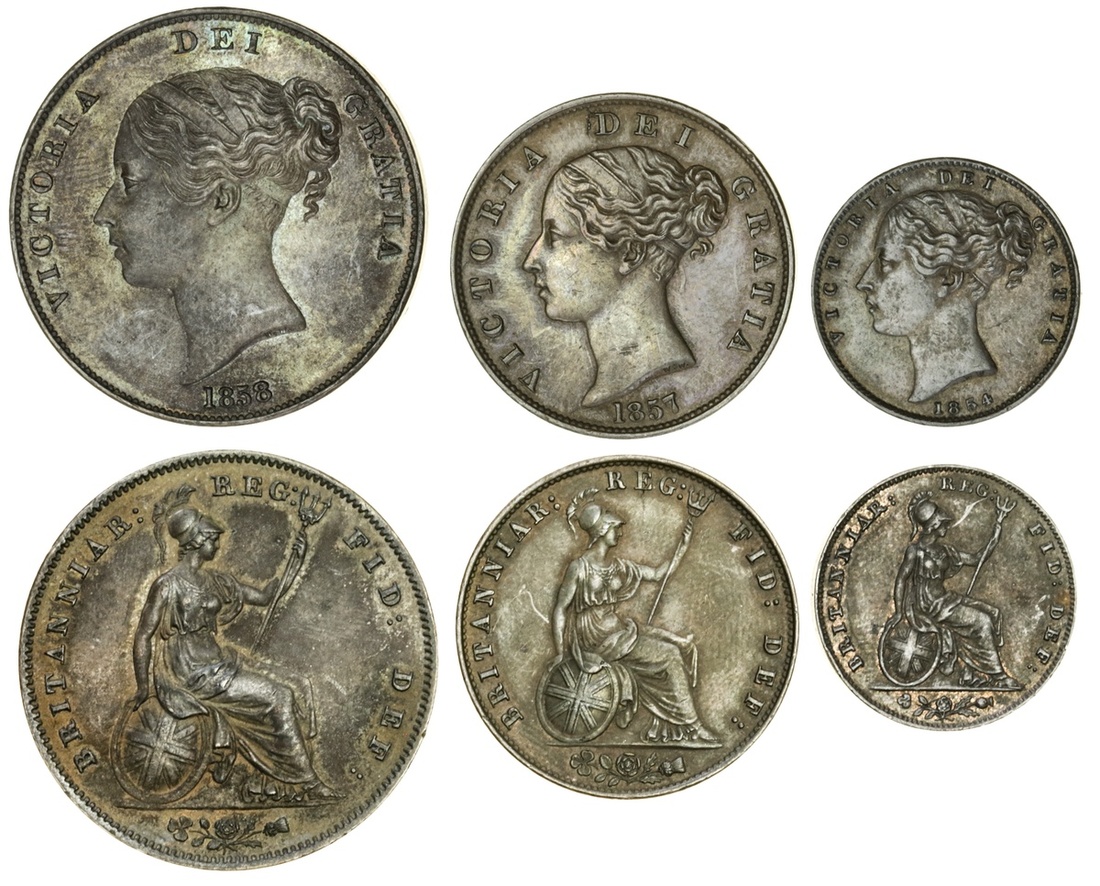 Victoria (1837-1901), Penny, 1858, young head left, rev. Britannia seated (S.3948), Halfpenny, 1857, similar (S.3949), Farthing, 1854, similar (S.3950), near extremely fine or better (3)