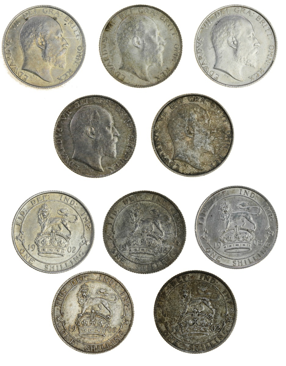 Edward VII (1901-10), Shillings, 1902 (5), bare head right, rev. lion atop crown (ESC 3587; S.3982), very fine to good extremely fine (5)