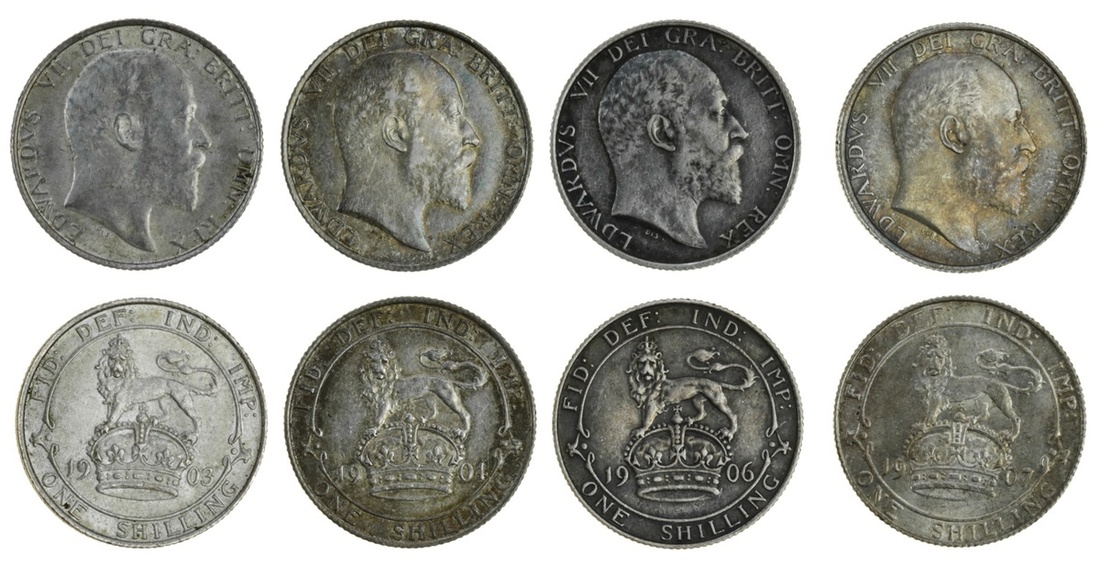 Edward VII (1901-10), Shillings (4), 1903, 1904, 1906, 1907, bare head right, rev. lion atop crown (ESC 3589, 3590, 3592, 3593; S.3982), very fine to good extremely fine (4)