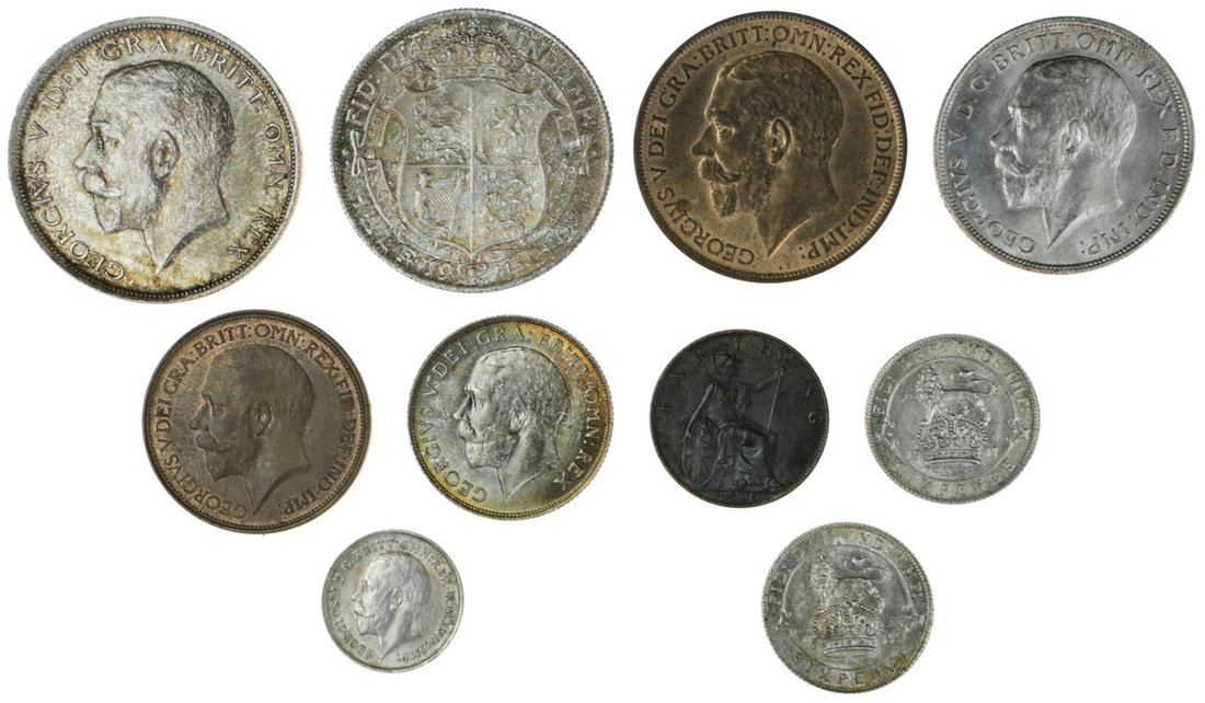 George V (1910-36), 1911 coinage, Halfcrowns (2), bare head left, rev. crowned shield in garter (S.4011); Florin, similar, rev. crowned shields cruciform (S.4012); Shilling, similar, rev. lion atop crown (S.4013); Sixpences (2), similar (S.4014); Threepence, similar, rev. value in wreath (S.4015); Penny, similar, rev. Britannia seated (S.4051); Halfpenny, similar (S.4056); Farthing, similar (S.4059), extremely fine or better, some with lustre and toning (10)