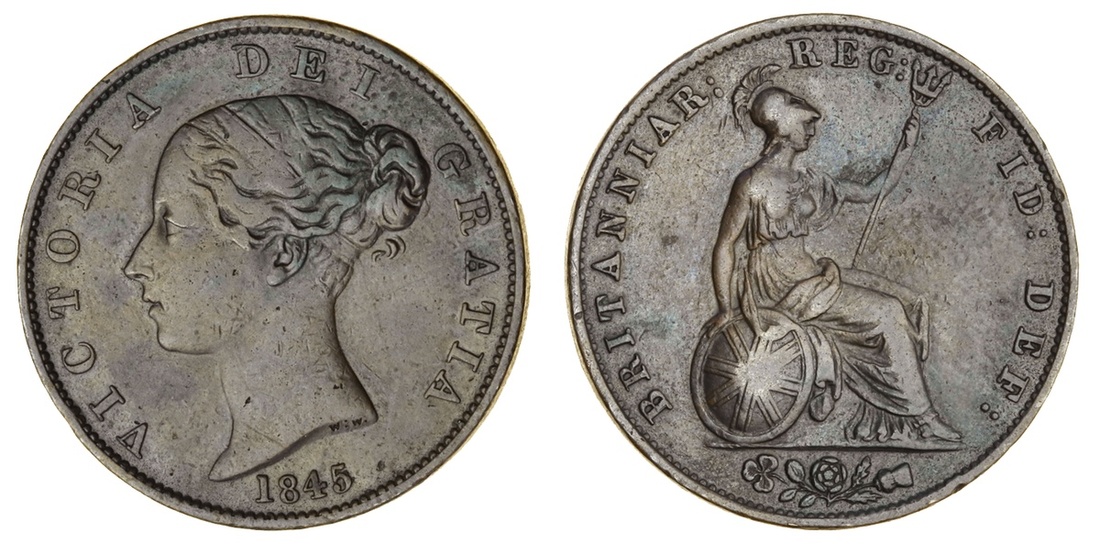 Victoria (1837-1901), Halfpenny, 1845, young head left, date below, rev. Britannia seated (S.3949), very fine, marbled chocolate and dark toning. The key copper Halfpenny date, very rare