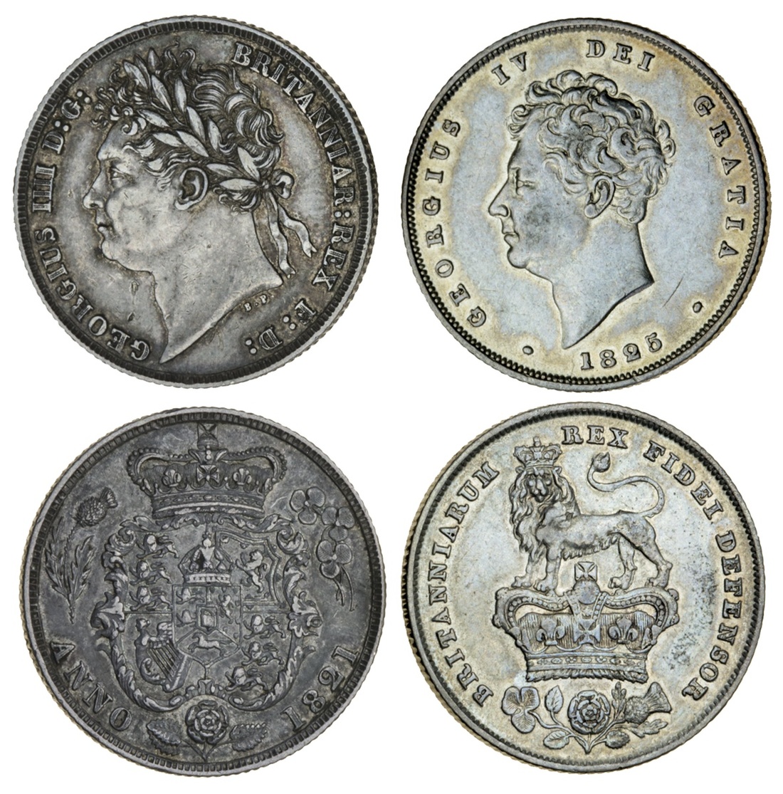 George IV (1820-30), Shillings (2), 1821, laureate head left, rev. crowned garnished shield (ESC 2396; S.3810); 1825, bare head left, rev. lion atop crown (ESC 2405; S.3812), both very fine (2)