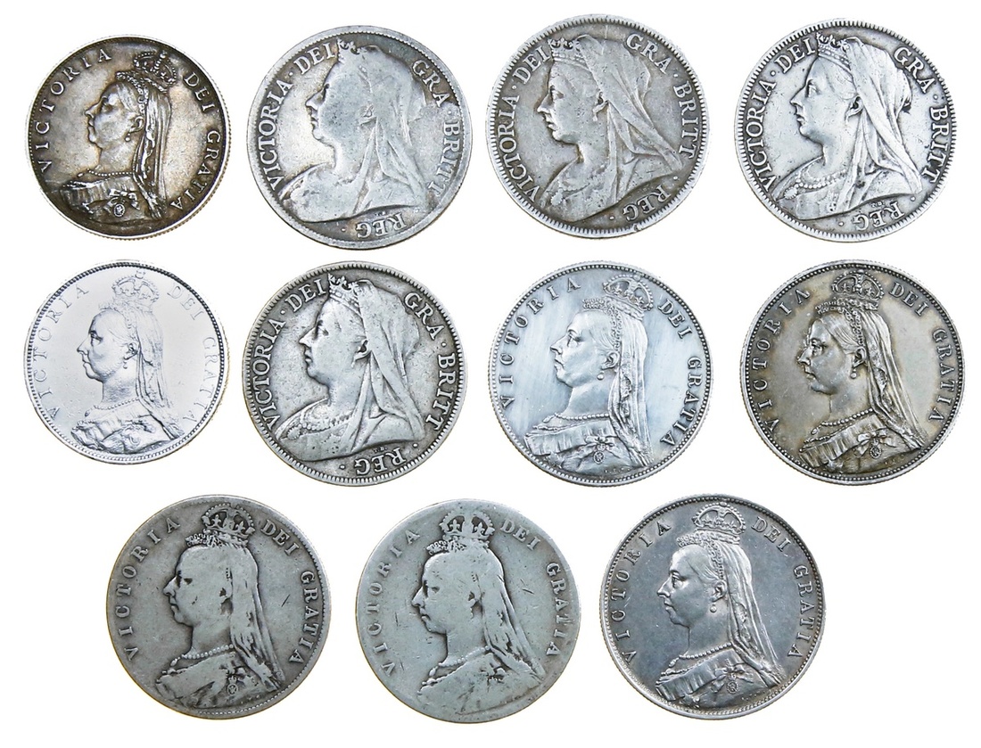 Victoria (1837-1901), Halfcrowns (9), 1887 (3); 1889 (2), Jubilee bust left, rev. crowned, square shield in Garter (S.3924), also, old head (4), 1895; 1896; 1899 (2), similar (S.3938); additionally, Florins (2), 1887; 1889, as first, rev. crowned shields cruciform, national emblems adorn sceptres in angles (S.3925), fair to extremely fine, some cleaned (11)