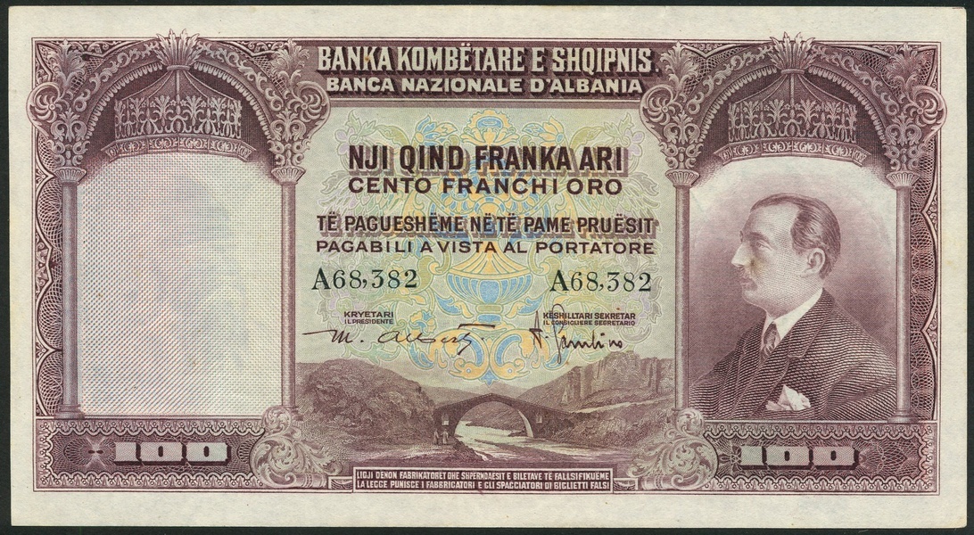 Banca Nazionale D'Albania, 100 franka ari, ND (1926), serial number A68,382, lilac on multicolour, Gosmiqe Bridge at low centre, portrait of King A Zogu at right, reverse lilac and teal, value in oval at left, landscape and river Drin at centre