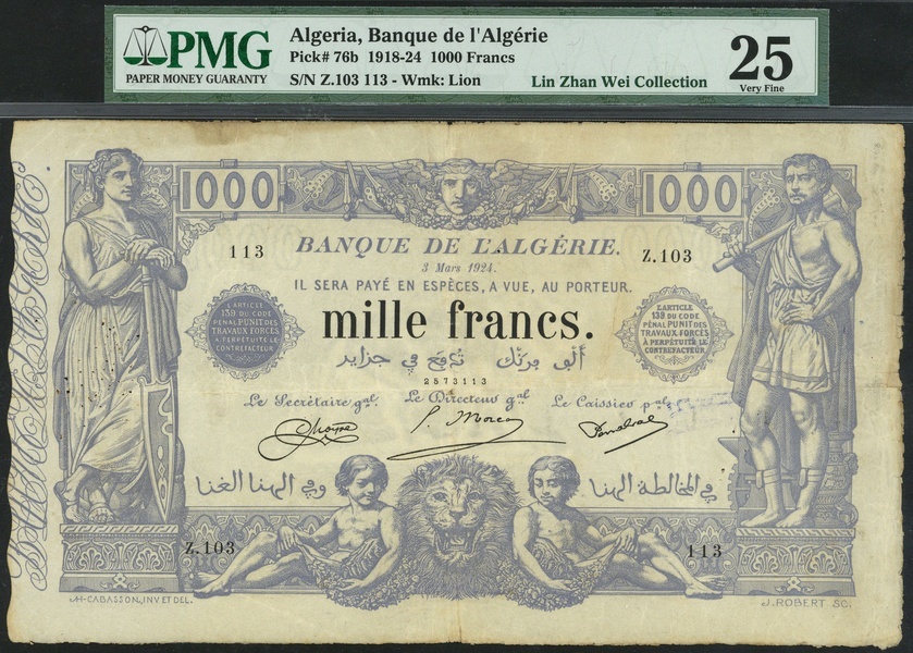 (x) Banque de L'Algerie 1000 francs, 3 March 1924, serial number Z.103 113, light blue, woman with oar at left, blacksmith at right, lion flanked by cherubs low centre, reverse, allegorical figures at left and right, beehive at centre, ornate top and low border