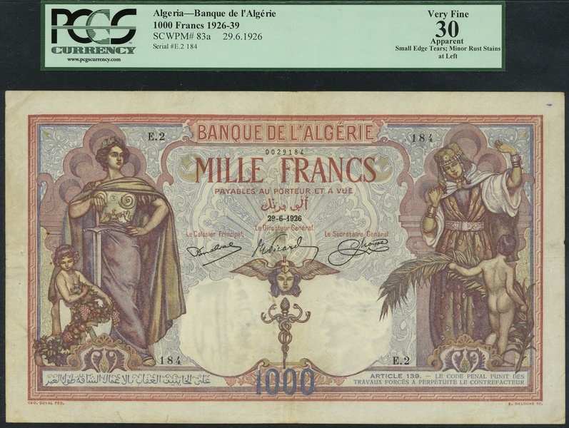 (x) Banque de L'Algerie, Algeria, 1000 francs, 29 June 1926, serial number E.2 0029184, brown violet and blue, woman with sword and child at left, Algerian woman with child at right, reverse, woman representing France with hand on shoulder of Arab woman,