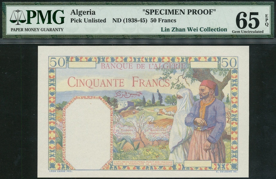 (x) Algeria, specimen proof 50 francs, ND (1938-45), no serial number, multicolour, man and woman in traditional dress at right, ornate border, reverse, ruins of amphitheatre