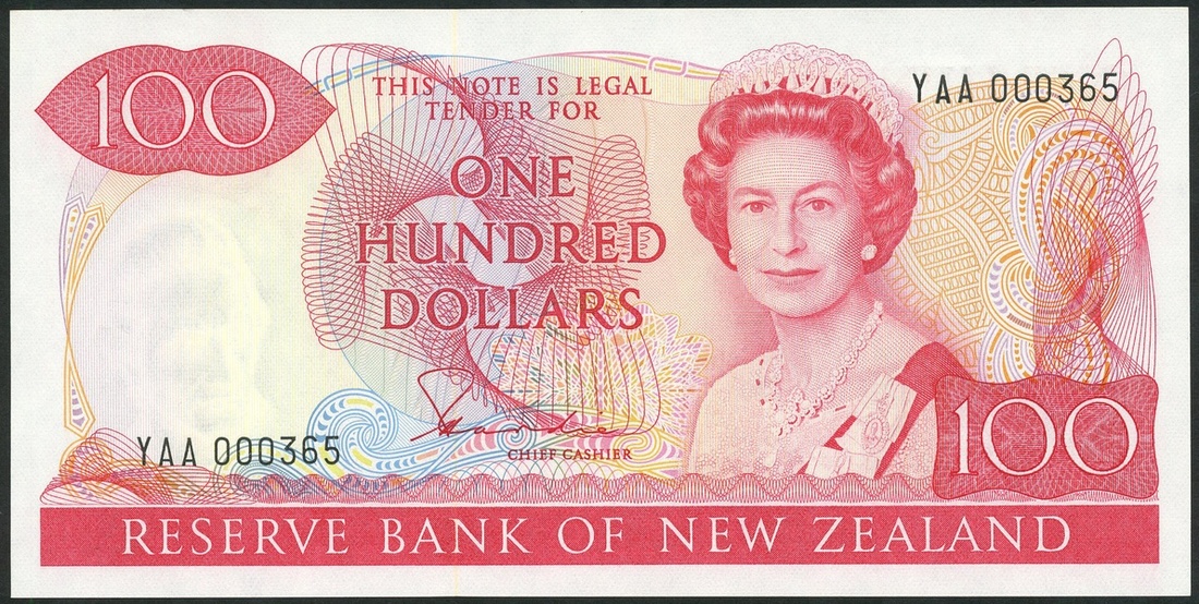 Reserve Bank of New Zealand, a complete set of notes comprising, $1, $2, $5, $10, $20, $50, $100, ND (1981), all with matching serial number 000365, brown, purple, orange, blue, green, light orange and red respectively, all feature portrait Queen Elizabeth II at centre right, Hardie signature, reverses, various indigenous birds of New Zealand