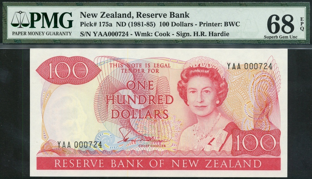(x) Reserve Bank of New Zealand, $100, ND (1981-85), serial number YAA 000724, red on light yellow and blue, portrait Queen Elizabeth II at right, value top left, centre and low right, reverse, takahe bird at centre, mountain daisy flower at centre left