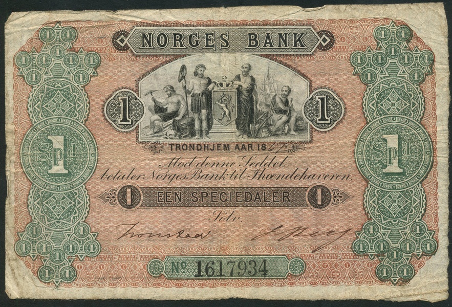 Norges Bank, 1 speciedaler, 1867, serial number 1617934, black, red and green, crowned arms, with four allegorical figures at top centre, reverse red and green, arms at centre