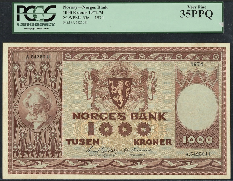 Norges Bank, 1000 Kroner, 1974, serial number A.5425041, red-brown on green underprint, Henrik Ibsen at left, crowned arms at centre, elderly man and child on reverse