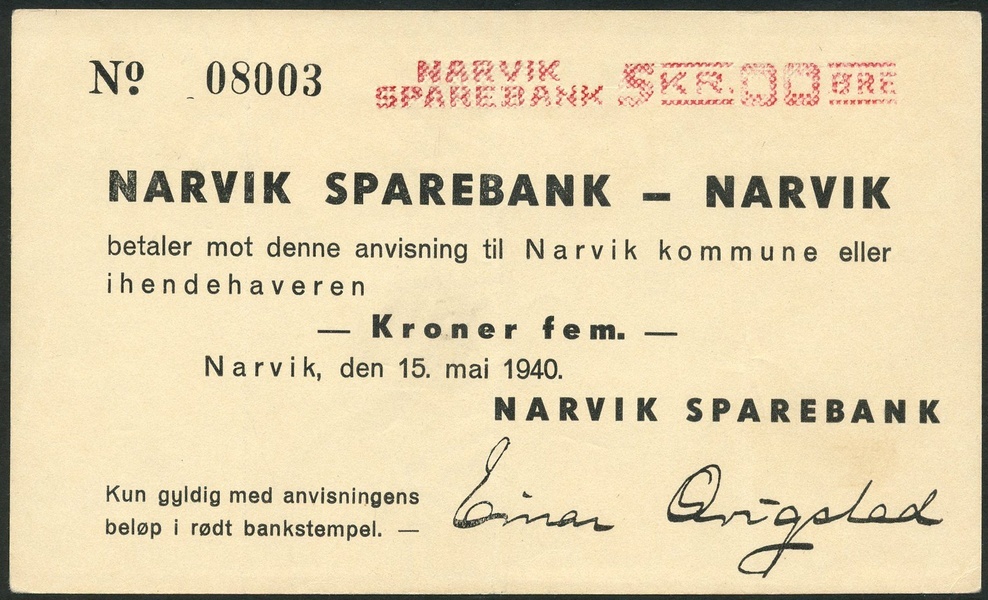 Narvik Sparebank, Norway, 5 kroner, 15 May 1940, serial number 08003, black text on cream paper, red text top right with bank title and value, printed signature of