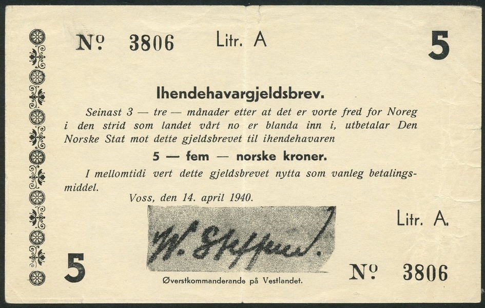 Voss siege note, Norway, 5 kroner, 14 April 1940, serial number 3806, black text on cream paper, facsimile signature of Steffens low centre