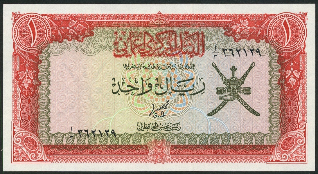 Central Bank of Oman, 100 baisa, 200 baisa, 1/2 rial, 1 rial, ND (1976), brown, purple, green and red respectively, arms at right, also, 100 baisa, 1994, and 100 baisa, 1995, both feature portrait Sultan Qaboos bin Said at right