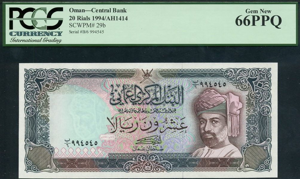 Central Bank of Oman, 20 rials, 1994, serial number B/6 994545, grey-green on multicolour underprint, portrait Sultan Qaboos bin Said at right, value top left and right, highly ornate border, reverse, bank headquarters