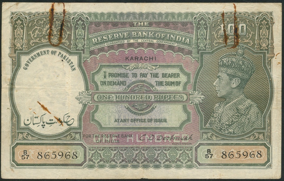 Pakistan, Reserve Bank of India, 100 rupees, Karachi, ND (1938-), serial number B/57 865968, green and lilac, George VI at right, Deshmukh signature, GOVERNMENT OF PAKISTAN in text at left, reverse green, tiger at centre