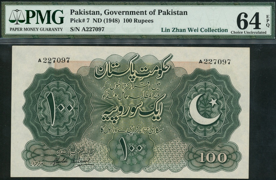 (x) Government of Pakistan, 100 rupees, ND (1948), serial number A227097, green, crescent moon and star in ornate tablet at right, reverse, guilloche patterns