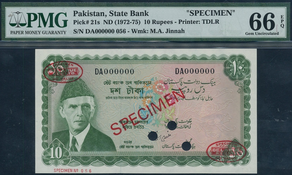 (x) State Bank of Pakistan, specimen 10 rupees, ND (1972-75), serial number DA000000, green on multicolour underprint, portrait Mohammed Ali Jinnah at left, value in each corner, flowers at centre, reverse, Shalimar Gardens in Lahore