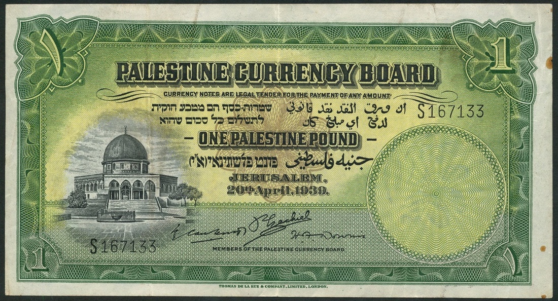 Palestine Currency Board, £1, 20 April 1939, serial number S167133, green, black and yellow, Dome of the Rock at left, value at each corner, reverse green, Tower of David at centre