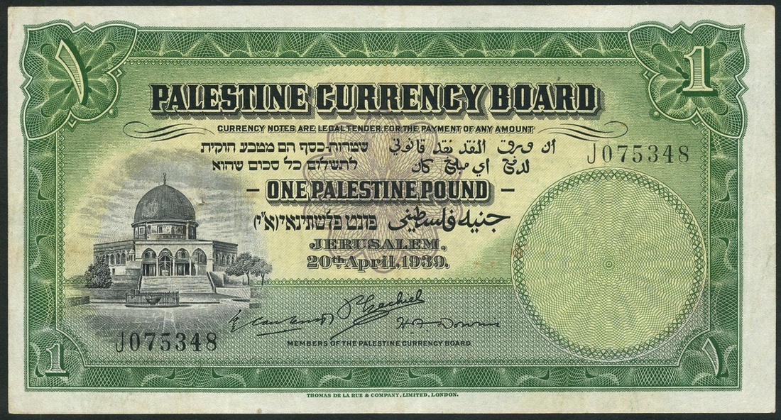 (x) Palestine Currency Board, £1, 20 April 1939, serial number J075348, black and green on yellow and purple underprint, Dome of the Rock at left, value at centre and corners, reverse green, Tower of David at centre, Ezechiel, Calcutt and Downie signatures