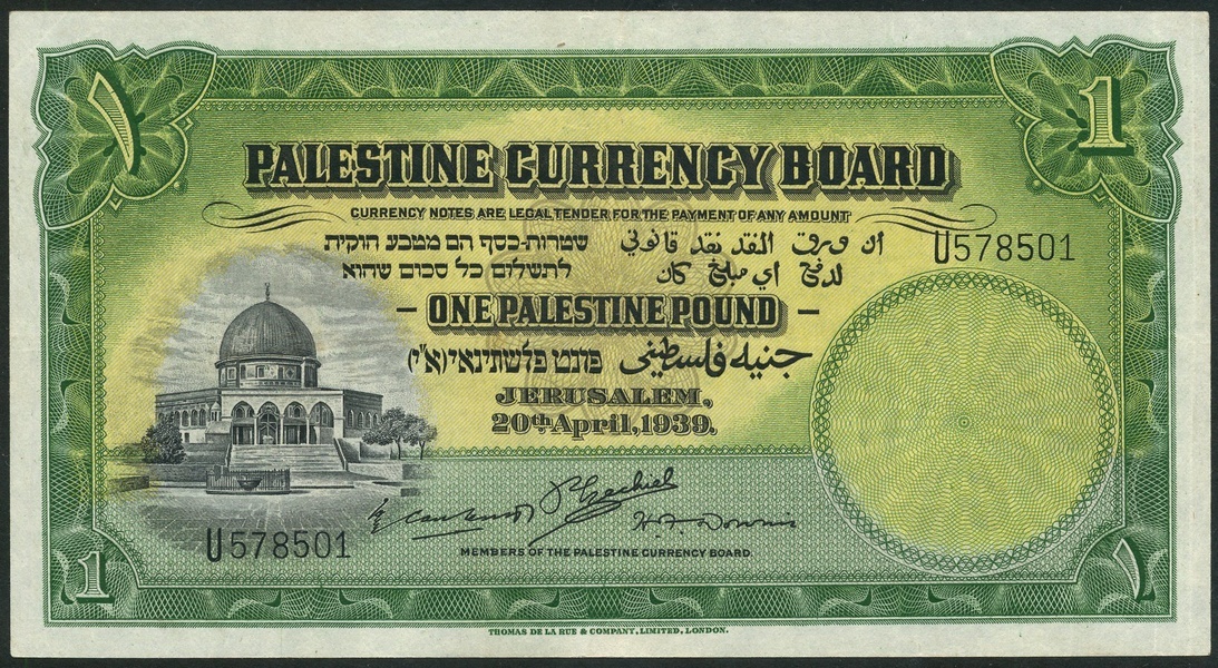 (x) Palestine Currency Board, £1, 20 April 1939, serial number U578501, black and green on yellow and purple underprint, Dome of the Rock at left, value at centre and corners, reverse green, Tower of David at centre, Ezechiel, Calcutt and Downie signatures