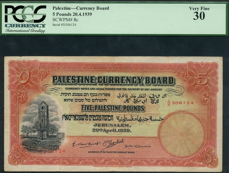 (x) Palestine Currency Board, £5, 20 April 1939, serial number D306124, black and orange on green and orange underprint, Crusaders Tower at Ramleh at left, value at each corners, reverse orange, Tower of David at centre