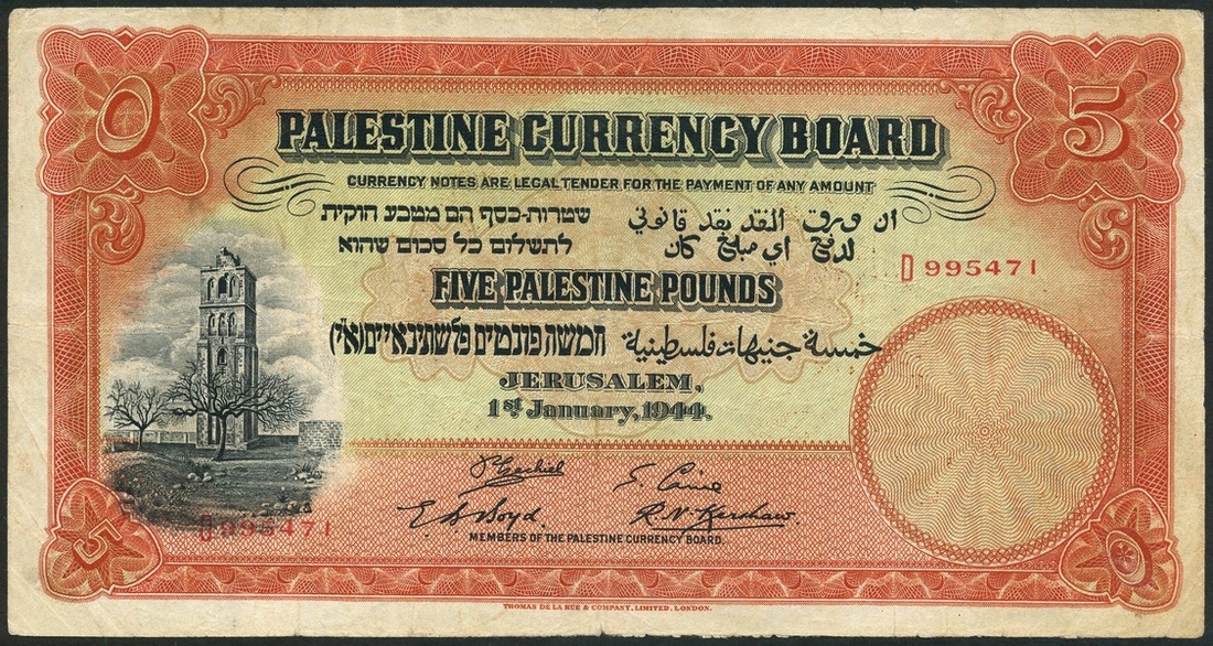 (x) Palestine Currency Board, £5, 1 January 1944, serial number D995471, black and orange on orange and green underprint, Crusaders Tower at Ramleh at left, value at centre and corners, reverse orange, Tower of David at centre, Ezechiel, Caine, Boyd and Kershaw signatures