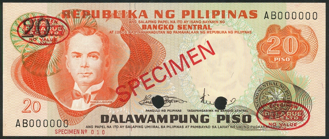 (†) Philippines Central Bank, specimen 10 pesos (3), two black, three Fathers, one green, Mabini, specimen 20 pesos (3), two black, Bonifacio and Jacinto and one orange, Quezon