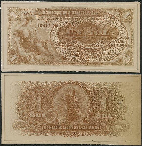Cheque Circular Peru, photographic reproduction obverse and reverse 1 sol, 1914, extremely rare and highly unusual (5)