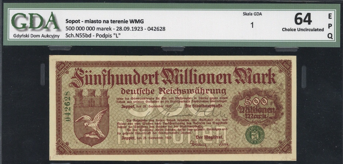 Sopot, Poland, a small group of notes as follows, 5,000,000 marks, 13 August 1923, serial number 115742, dark brown on light blue underprint, uniface 20,000,000,000 marks, 28 September 1923, serial number 005591*, dark green on light yellow underprint, 500,000,000 marks, 28 Septe4mber 1923, serial number 042628, reddish brown on light grey underprint