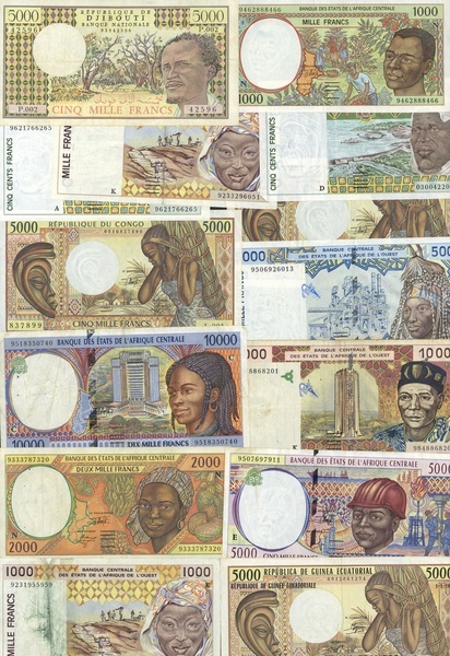 A group of African notes comprising Central West African States 1000 francs (10), 500 francs (7), 5000, 10000 francs, Central African States 2000, 5000 (6), 10000 francs (3), Congo 5000 francs (2), Djibouti 5000 francs and Equatorial Guinea 5000 francs, 1986