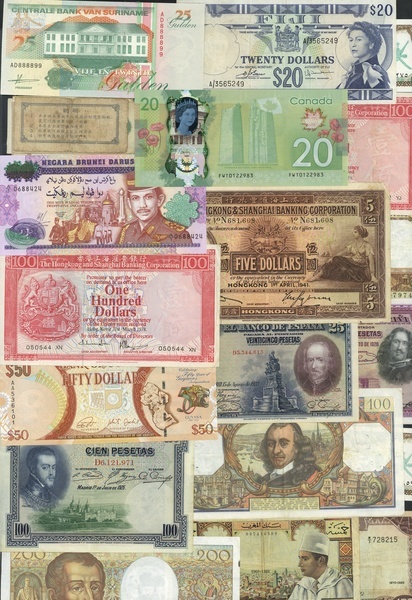 Mixed World, a good variety of notes comprising, Suriname, 25 gulden, 1991, Canada, $20 (commemorative issue), 2015, Fiji, $20, ND (1974), Brunei, $25 (2), 1992 (consecutive serial number), HSBC, $5, 1941, $100 (2), 1978, 1979, Oman Currency Board, 100 baisa (3), 1/4 rial omani (2), 1/2 rial omani, Central Bank of Oman, 100, 200 baisa, quarter and half rial, Macau, 50 avos, 1940, 10 patacas (4), (last four digits of serial number identical), Bank of Guyana, $50 (11), consecutive serial numbers, Spain, 25, 50 pesetas, 1928 and 100 pesetas, 1925, France, 100 francs, 1976, 1977, 200 francs, 1985, 1986, Morocco, 5 dirhams, 100 dirhams (2), China (22)