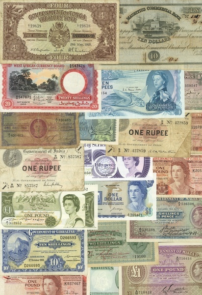 A selection of Commonwealth notes comprising Jamaica 5 shillings, 1957, Falklands (2), Cyprus £1, 1955, 1/-, 1946, East Africa (2), Tonga 4 shillings, 1939, Malta (5), Gibraltar (4), Bermuda, Saint Helena (2), Seychelles 10 rupees, 1968, India George V 1 rupee (3), British West Africa, 20 shillings, 1953, Mauritius 10 rupees, 1843,