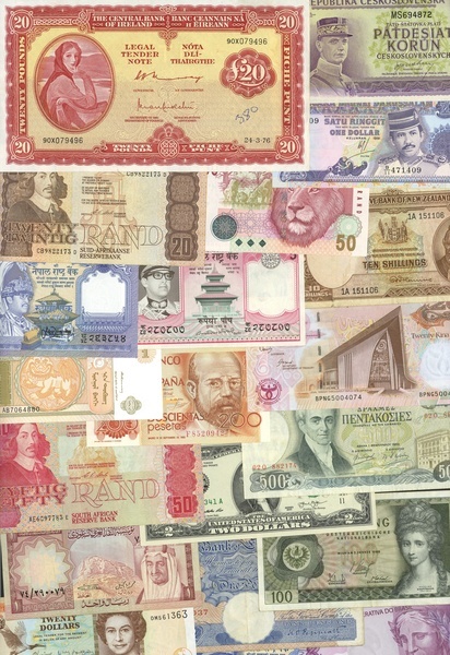 A large group of mixed World Banknotes, including, Brunei (2), Greece (7), Portugal (6), Austria (2), Saudi Arabia (2), Italy (14), Ireland (2), South Africa (4), Australia (7), Bermuda (3), Brazil (3), Nepal (5), Finland (1), East Caribbean (1), Spain (1), New Zealand (1), Papua New Guinea (1), Argentina (1), Bank of England (1), Belize (1), USA, $1 (10 consecutive), $20, Denmark (2), Kuwait, commemorative issue 1 dinar, Germany (38), Poland (3), Notgeld (18)