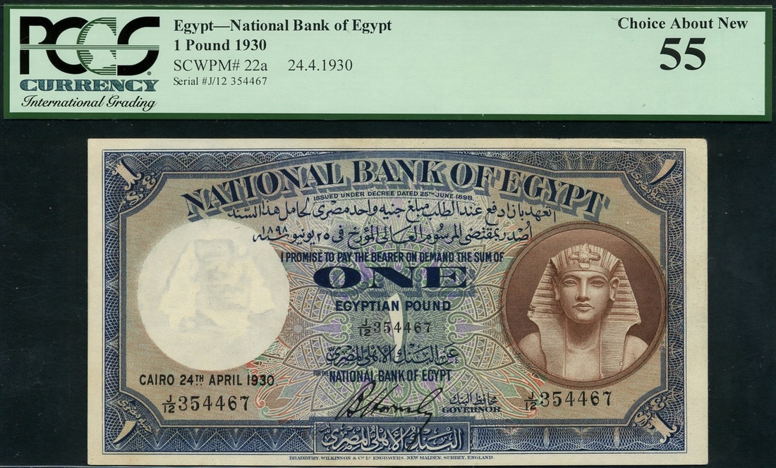 (x) National Bank of Egypt, £1, 24 April 1930, serial number J/12 354467, blue on multicolour underprint, King Tutankhamen at right, value at centre and each corner, Hornsby signature, reverse green, the Mosque of al-Mansour Seif el-Dein Qa'la un at centre