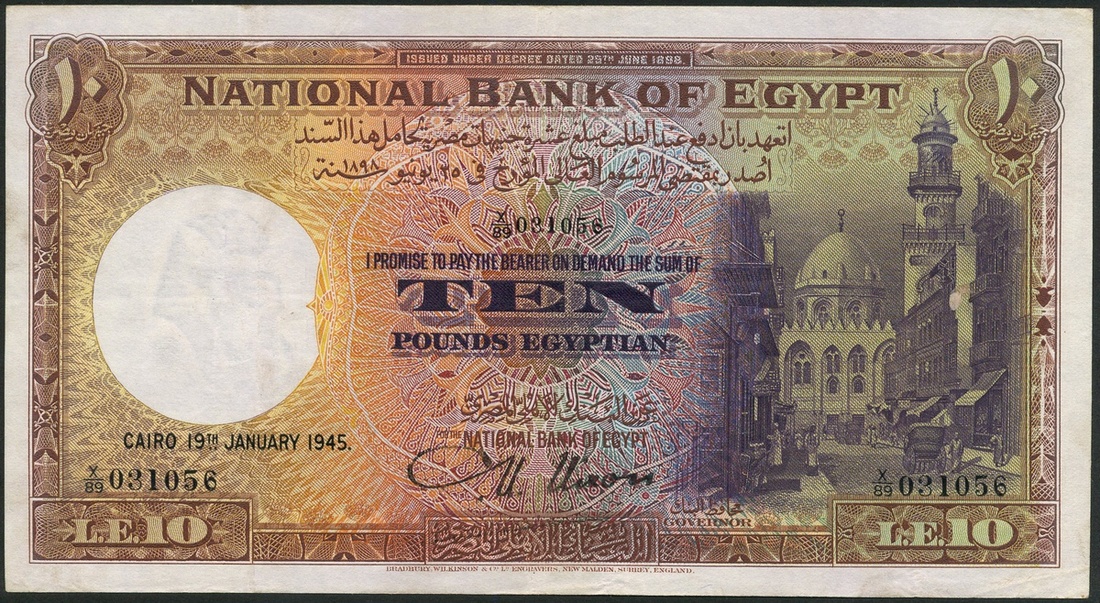 (x) National Bank of Egypt, £10 (3), 1945, 1950 and 1951, prefixes X/89, X/134 and X/146, brown and purple on multicolour underprint, street scene at right, value at centre and corners, Nixon, Leith-Ross and Saad signatures