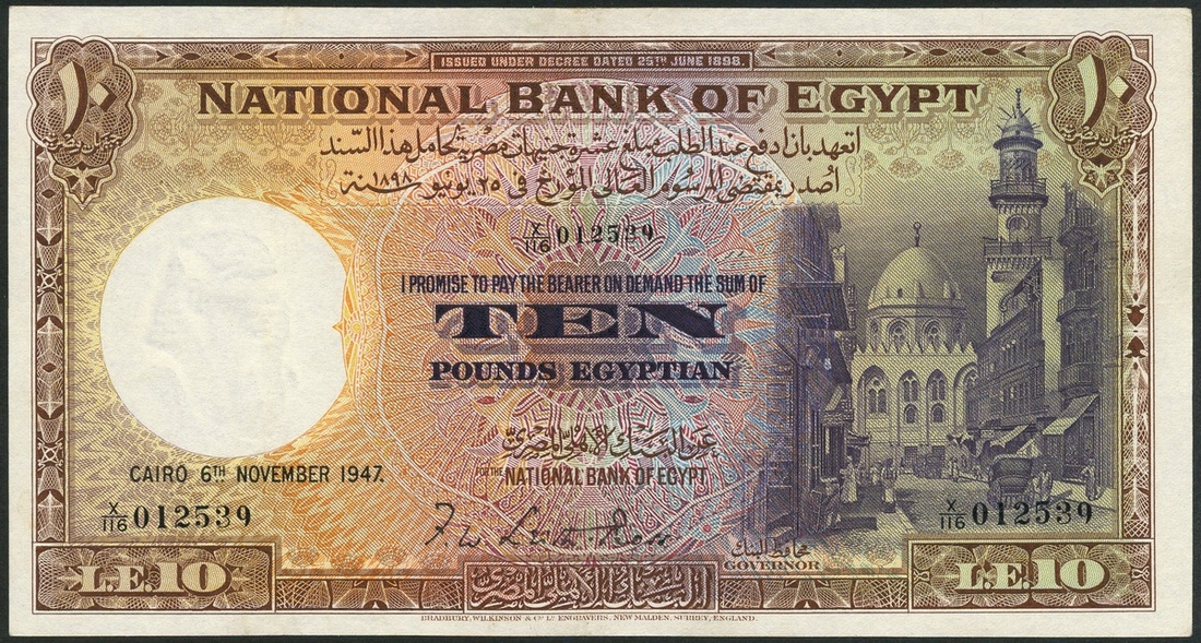 (x) National Bank of Egypt, 10 pounds, 6 November 1947, serial number X/116 012539, brown, violet and multicoloured, the Mosque of Qala'un and street scene at right, value in each corner, Leith-Ross signature, reverse blue, green and pink, farm scene at left, palm trees at centre