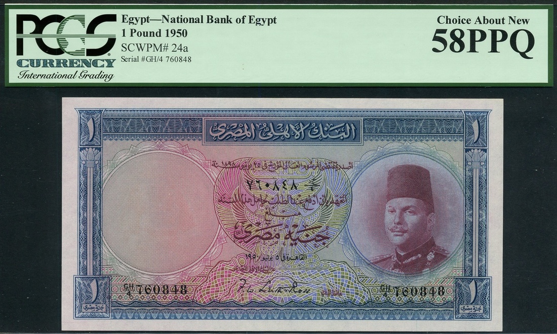 (x) National Bank of Egypt, £1, 1950, serial number CH/4 760848, blue and red on multicolour underprint, King Farouk at right, value at corners, reverse blue, temple at centre, Leith-Ross signature