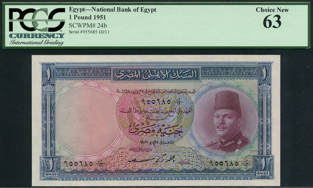 (x) National Bank of Egypt, £1, 1951, serial number DJ/11 955685, blue and red on multicolour underprint, King Farouk at right, value at corners, reverse blue, temple at centre, Saad signature