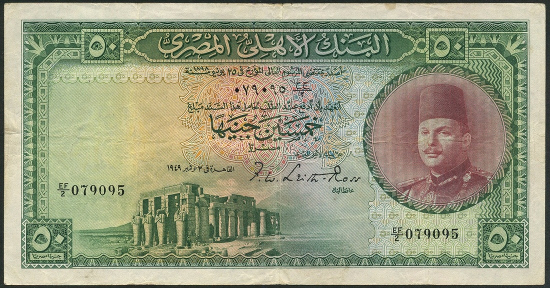 (x) National Bank of Egypt, £50, 1949, serial number EF/2 079095, green and red-brown on multicolour underprint, King Farouk at right, temple at low left, value at corners, reverse green, city scene