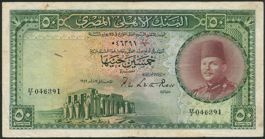 (x) National Bank of Egypt, £50 (2), 1949 and 1951, prefixes EF/2 and EF/3, green and red-brown on multicolour underprint, King Farouk at right, temple at low left, value at corners, reverse green, city scene